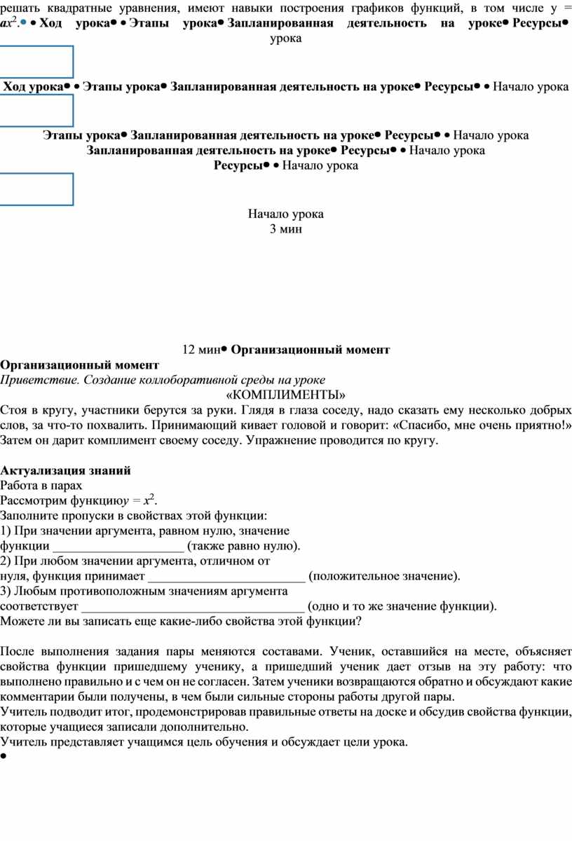 Учащиеся знают понятия «функция», «аргумент», «график функции», «область определения функции», «область значений функции», умеют решать квадратные уравнения, имеют навыки построения графиков функций, в том числе у = ах2. |