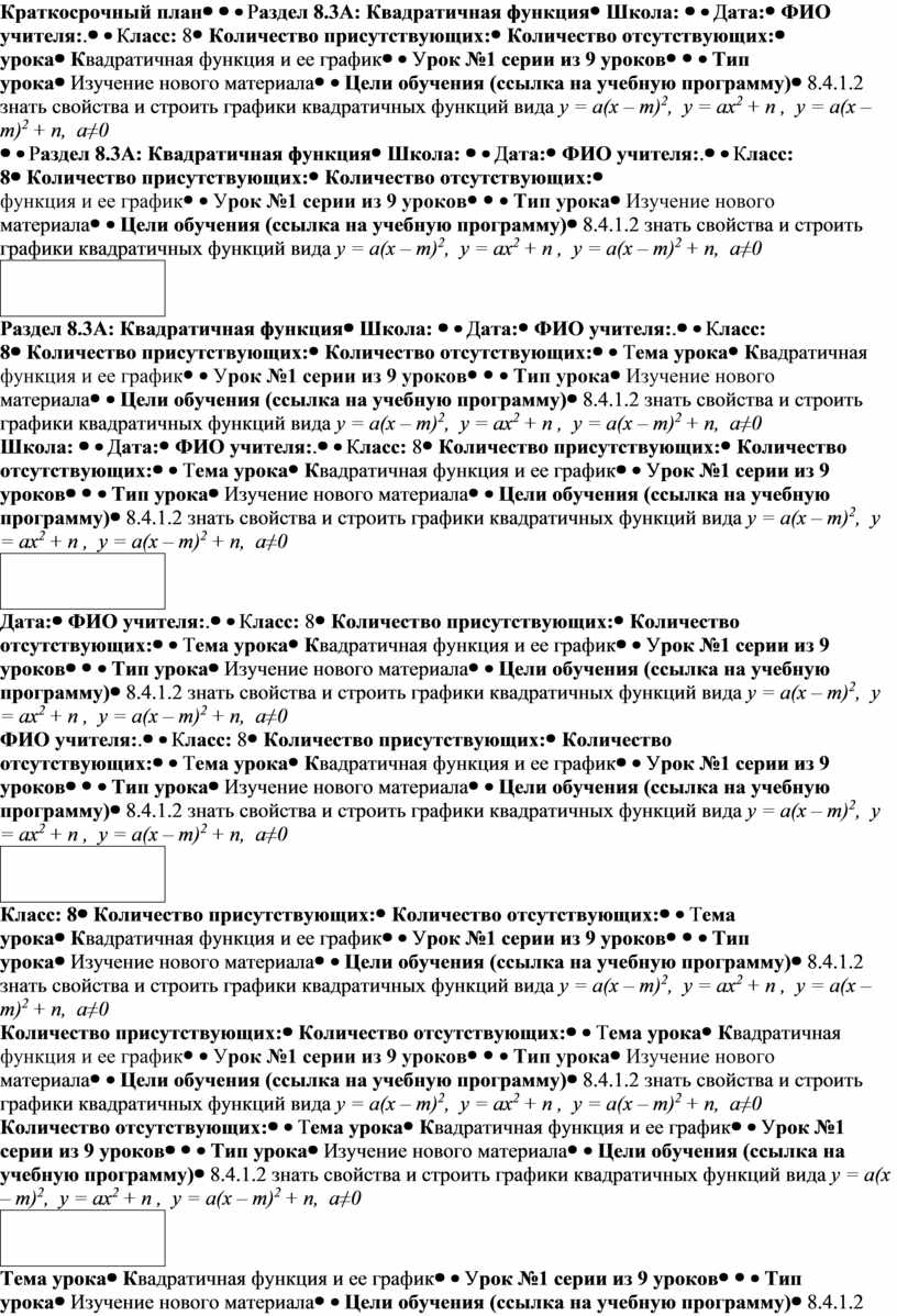8.4.1.2 знать свойства и строить графики квадратичных функций вида y = a(x – m)2, y = ax2 + n , y = a(x – m)2 + n, a≠0