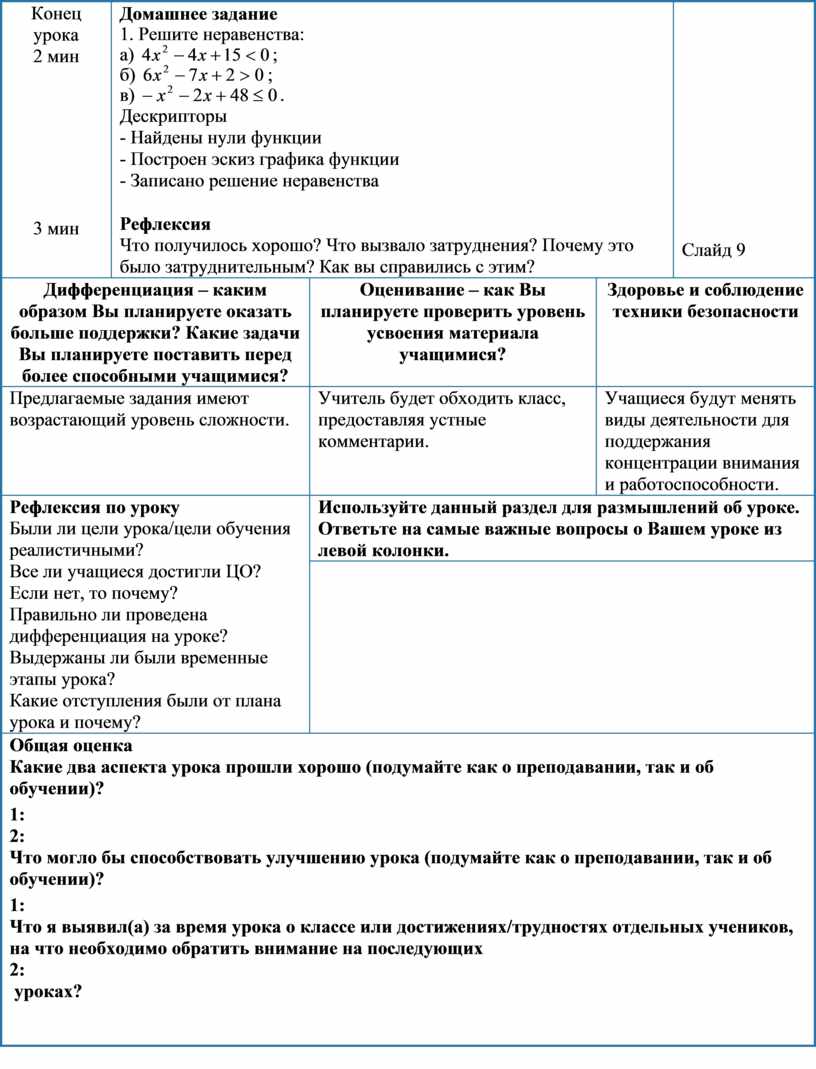 Дескрипторы - Найдены нули функции - Построен эскиз графика функции - Записано решение неравенства