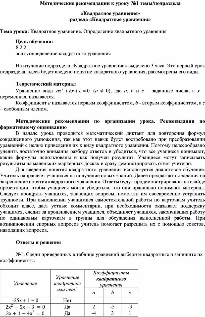 На изучение подраздела «Квадратное уравнение» выделено 3 часа. Это первый урок подраздела, здесь будет введено понятие квадратного уравнения, рассмотрены его виды.