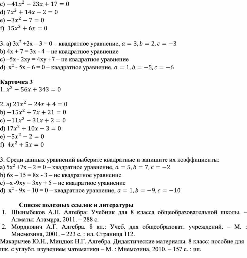 1. Шыныбеков А.Н. Алгебра: Учебник для 8 класса общеобразовательной школы. – Алматы: Атамұра, 2011. – 288 с.