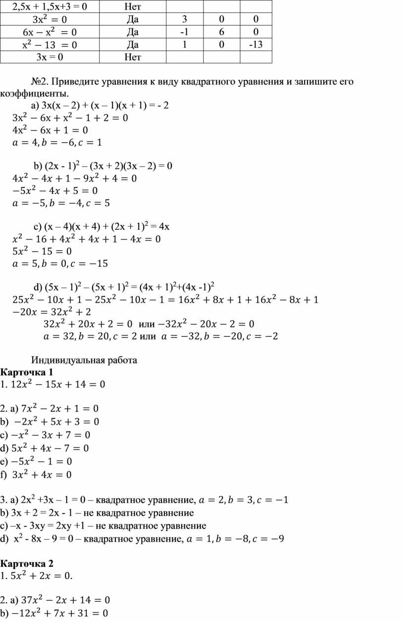 №2. Приведите уравнения к виду квадратного уравнения и запишите его коэффициенты.