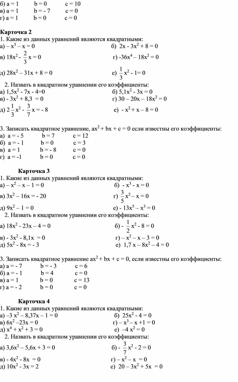 Карточка 4 1. Какие из данных уравнений являются квадратными: а) –3 х2 – 8,37х – 1 = 0 б) 25х2 - 4 = 0 в) 6х2 –23х = 0 г) – х3 – х +1 = 0 д) х4 + х2 + 3 = 0 е) –4 х2 = 0 2. Назвать в квадратном уравнении его коэффициенты: а)