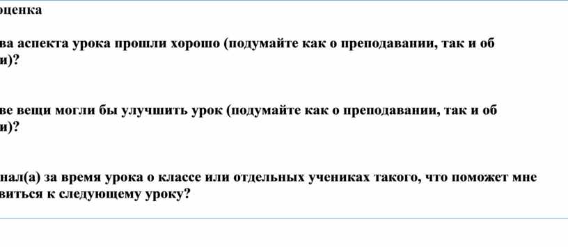 Какие два аспекта урока прошли хорошо (подумайте как о преподавании, так и об изучении)? 1: 2: Какие две вещи могли бы улучшить урок (подумайте как о преподавании, так и об изучении)? 1: 2: Что я узнал(а) за время урока о классе или отдельных учениках такого, что поможет мне подготовиться к следующему уроку?