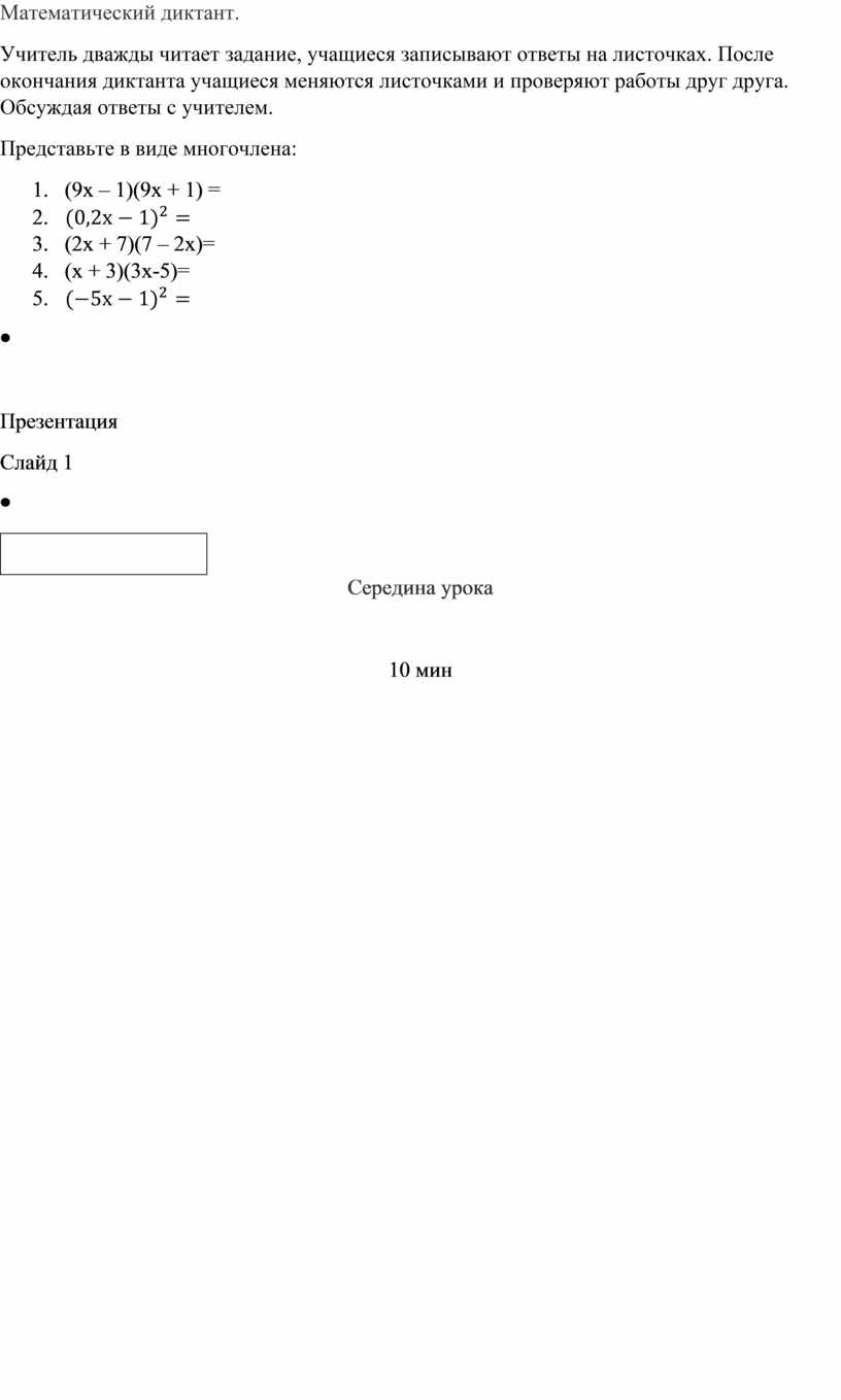 Актуализация знаний Математический диктант. Учитель дважды читает задание, учащиеся записывают ответы на листочках. После окончания диктанта учащиеся меняются листочками и проверяют работы друг друга. Обсуждая ответы с учителем. Представьте в виде многочлена: 1. (9х – 1)(9x + 1) = 2. 3. (2x + 7)(7 – 2х)= 4. (x + 3)(3x-5)= 5.