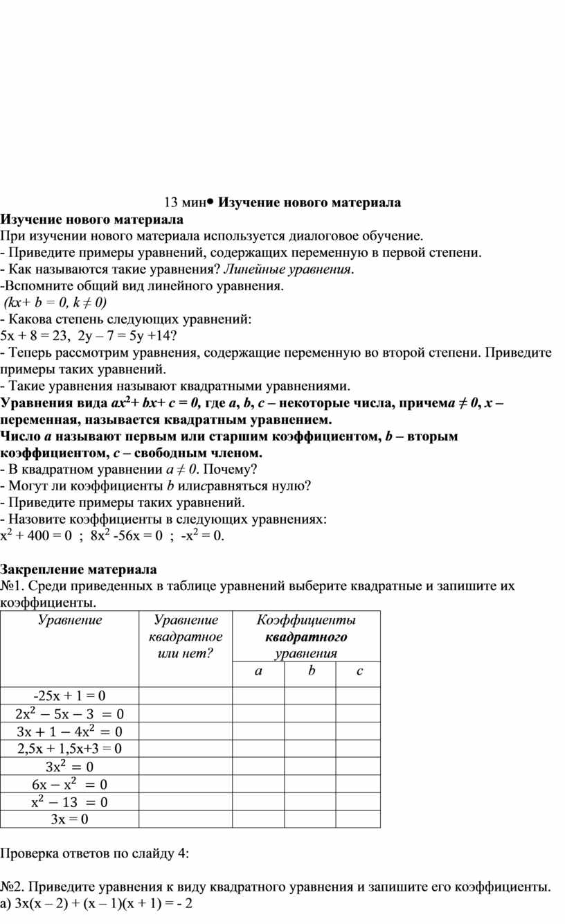 3. Среди данных уравнений выберите квадратные и запишите их коэффициенты: а)3х2 +2х – 3 = 0 b) 4x + 7 = 3x - 4 c) –5x - 2xy = 4xy +7. d) x2 - 5x – 6 = 0