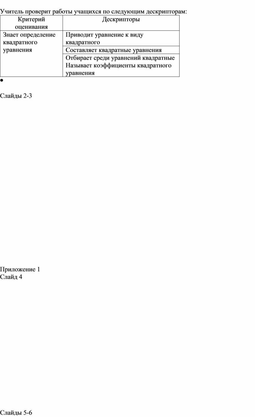 Индивидуальная работапо карточкам Учащиеся самостоятельно выполняют задания по карточкам, затем в группах сравнивают результаты, обсуждают решения, оценивают работы, используя дескрипторы. Карточка 1 1. Приведите уравнения к виду ах2 + bх + с = 0: (x – 3)(3x + 2) = (5х – 4)(3х – 2).