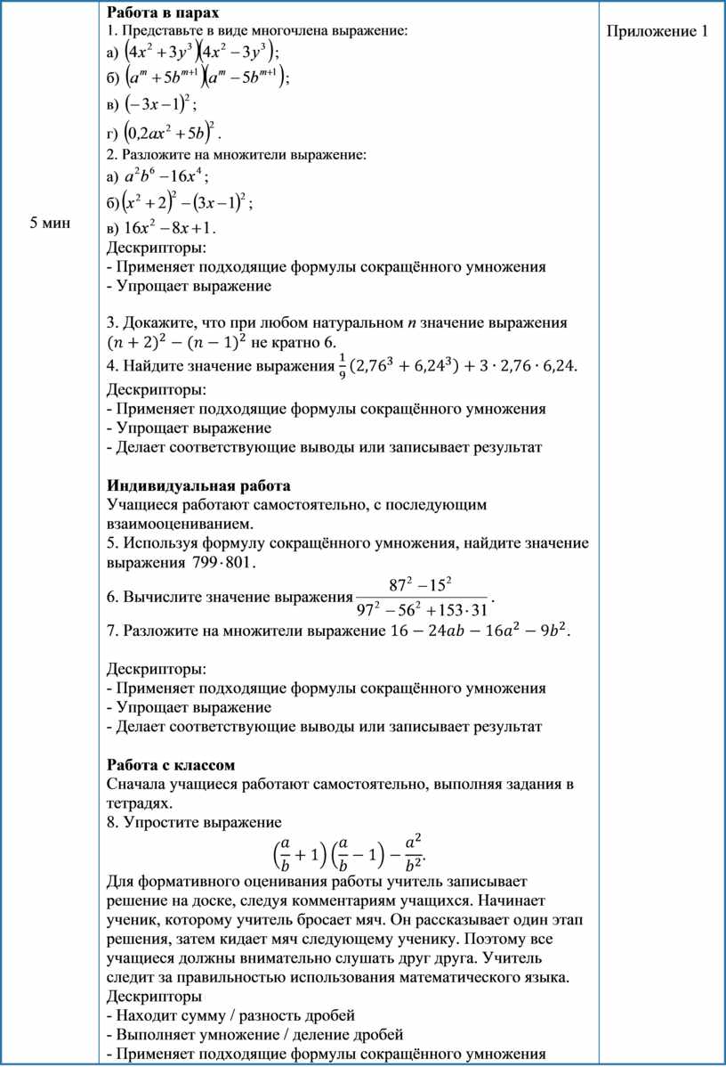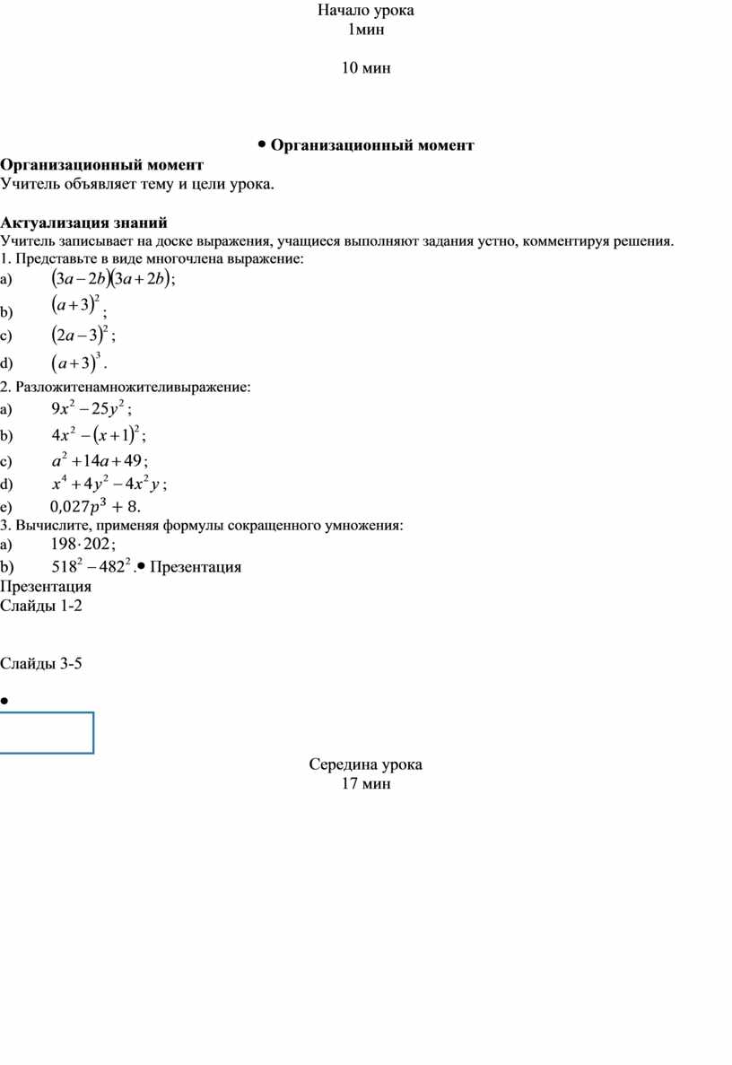 Учащиеся: - используют формулы сокращённого умножения и действия над многочленами для преобразования алгебраических выражений; - используют формулы сокращённого умножения для рационального счёта. |