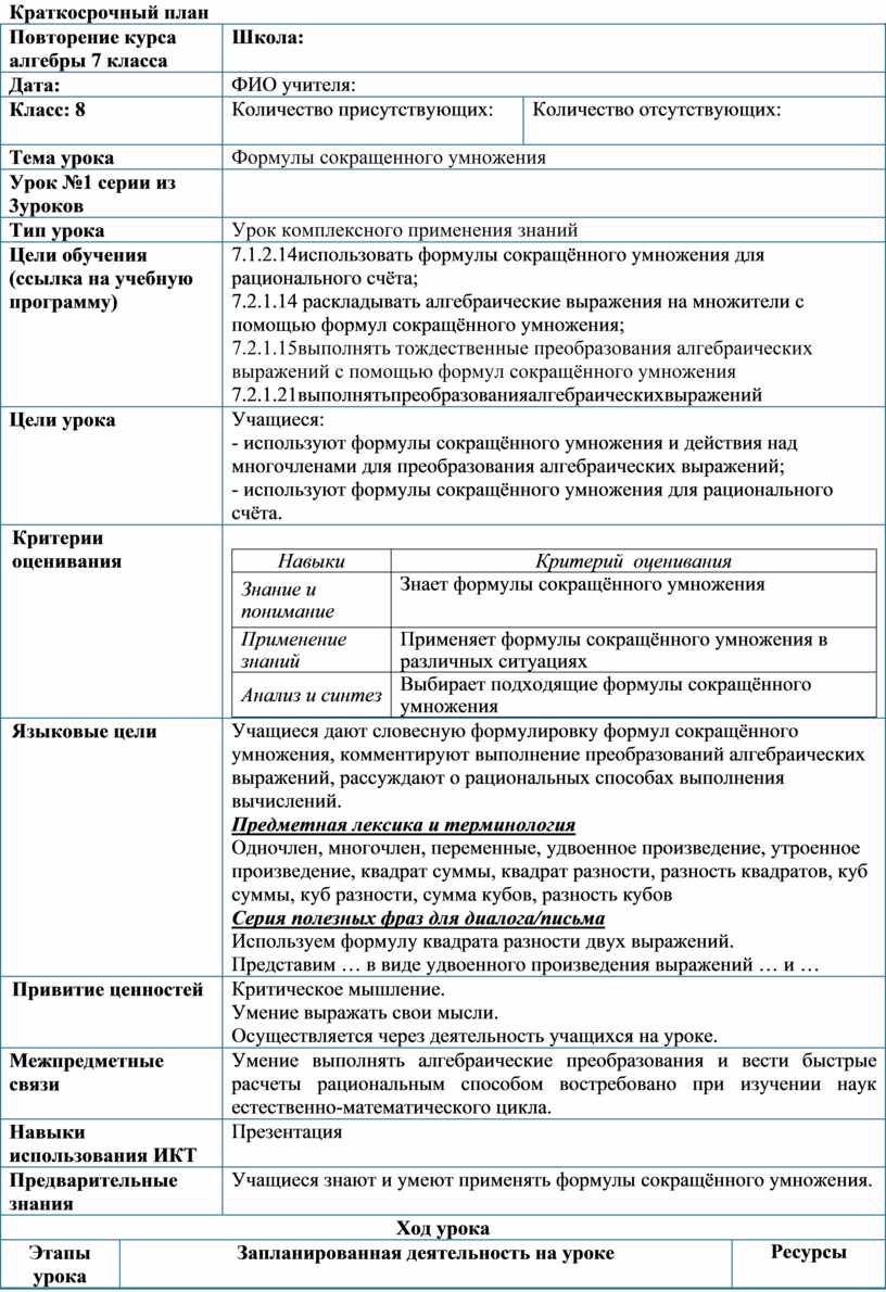 7.1.2.14использовать формулы сокращённого умножения для рационального счёта; 7.2.1.14 раскладывать алгебраические выражения на множители с помощью формул сокращённого умножения; 7.2.1.15выполнять тождественные преобразования алгебраических выражений с помощью формул сокращённого умножения 7.2.1.21выполнятьпреобразованияалгебраическихвыражений |
