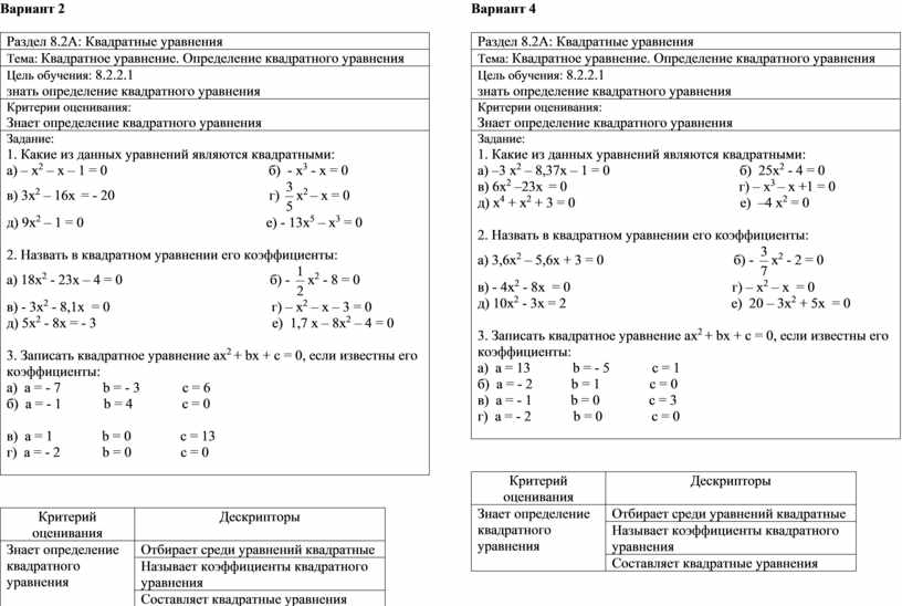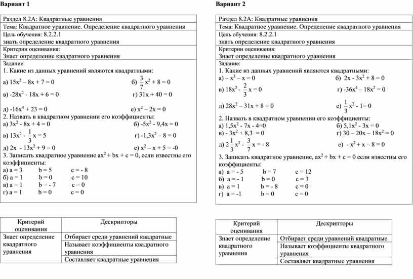 Цель обучения: 8.2.2.1 знать определение квадратного уравнения |