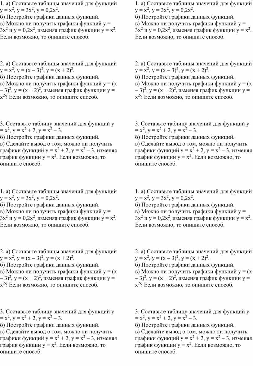 1. а) Составьте таблицы значений для функций у = х2, у = 3х2, у = 0,2х2.