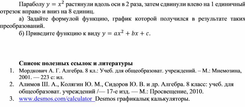 1. Мордкович А. Г. Алгебра. 8 кл.: Учеб. для общеобразоват. учреждений. – М.: Мнемозина, 2001. — 223 с: ил.