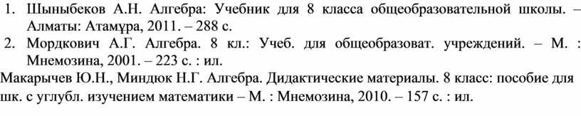 1. Шыныбеков А.Н. Алгебра: Учебник для 8 класса общеобразовательной школы. – Алматы: Атамұра, 2011. – 288 с.
