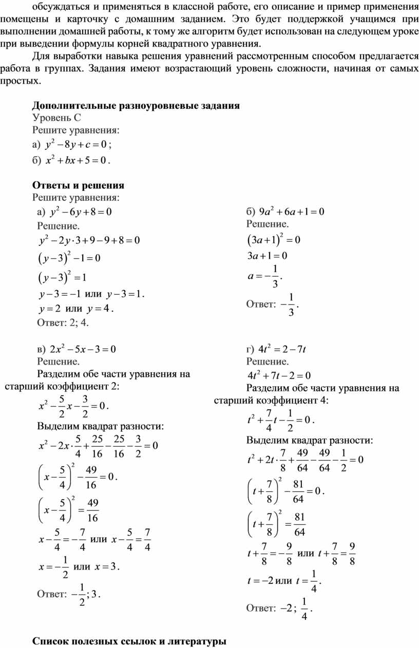 Учащимся предлагается задание на решение квадратного уравнения методом выделения квадрата двучлена. Следует каждый раз предоставлять учащимся время на обдумывание следующего шага решения, чтобы получить от них как можно больше идей и рассуждений, равно как и на создание алгоритма. Хотя алгоритм решения будет обсуждаться и применяться в классной работе, его описание и пример применения помещены и карточку с домашним заданием. Это будет поддержкой учащимся при выполнении домашней работы, к тому же алгоритм будет использован на следующем уроке при выведении формулы корней квадратного уравнения.