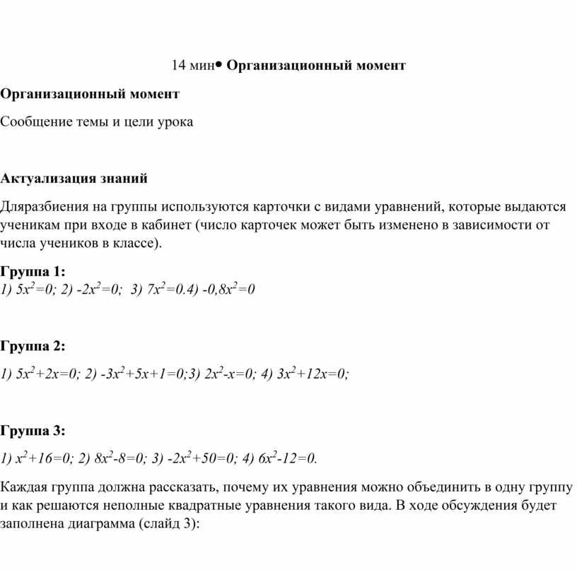 Группа 3: 1) х2+16=0; 2) 8х2-8=0; 3) -2х2+50=0; 4) 6х2-12=0. Каждая группа должна рассказать, почему их уравнения можно объединить в одну группу и как решаются неполные квадратные уравнения такого вида. В ходе обсуждения будет заполнена диаграмма (слайд 3):
