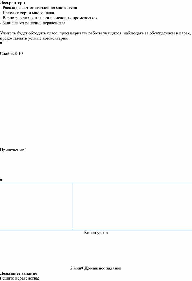 Закрепление нового материала Работа в парах Учащиеся решают неравенства: 1. 2. 3. 4. 5. 6. 7. 8. Закончив решение первого неравенства, ученик рассказывает решение учителю. Учитель слушает, корректирует ответ, дает рекомендации. Если решение верное, то ученик записывает свое имя на доске в таблице и может принять решение у следующего ученика, таким образом, каждый ученик будет формативно оценивать своих одноклассников и все ученики получат своевременную помощь. Дескрипторы: - Раскладывает многочлен на множители - Находит корни многочлена - Верно расставляет знаки в числовых промежутках - Записывает решение неравенства