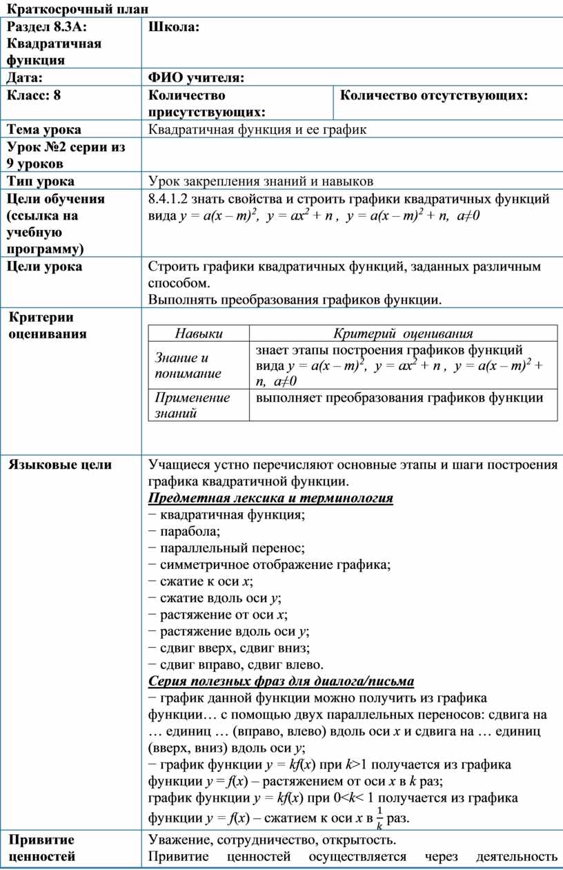 Учащиеся устно перечисляют основные этапы и шаги построения графика квадратичной функции. Предметная лексика и терминология − квадратичная функция; − парабола; − параллельный перенос; − симметричное отображение графика; − сжатие к оси х; − сжатие вдоль оси у; − растяжение от оси х; − растяжение вдоль оси у; − сдвиг вверх, сдвиг вниз; − сдвиг вправо, сдвиг влево. Серия полезных фраз для диалога/письма − график данной функции можно получить из графика функции… с помощью двух параллельных переносов: сдвига на … единиц … (вправо, влево) вдоль оси х и сдвига на … единиц (вверх, вниз) вдоль оси у; − график функции у = kf(х) при k>1 получается из графика функции y = f(x) – растяжением от оси х в k раз; график функции у = kf(х) при