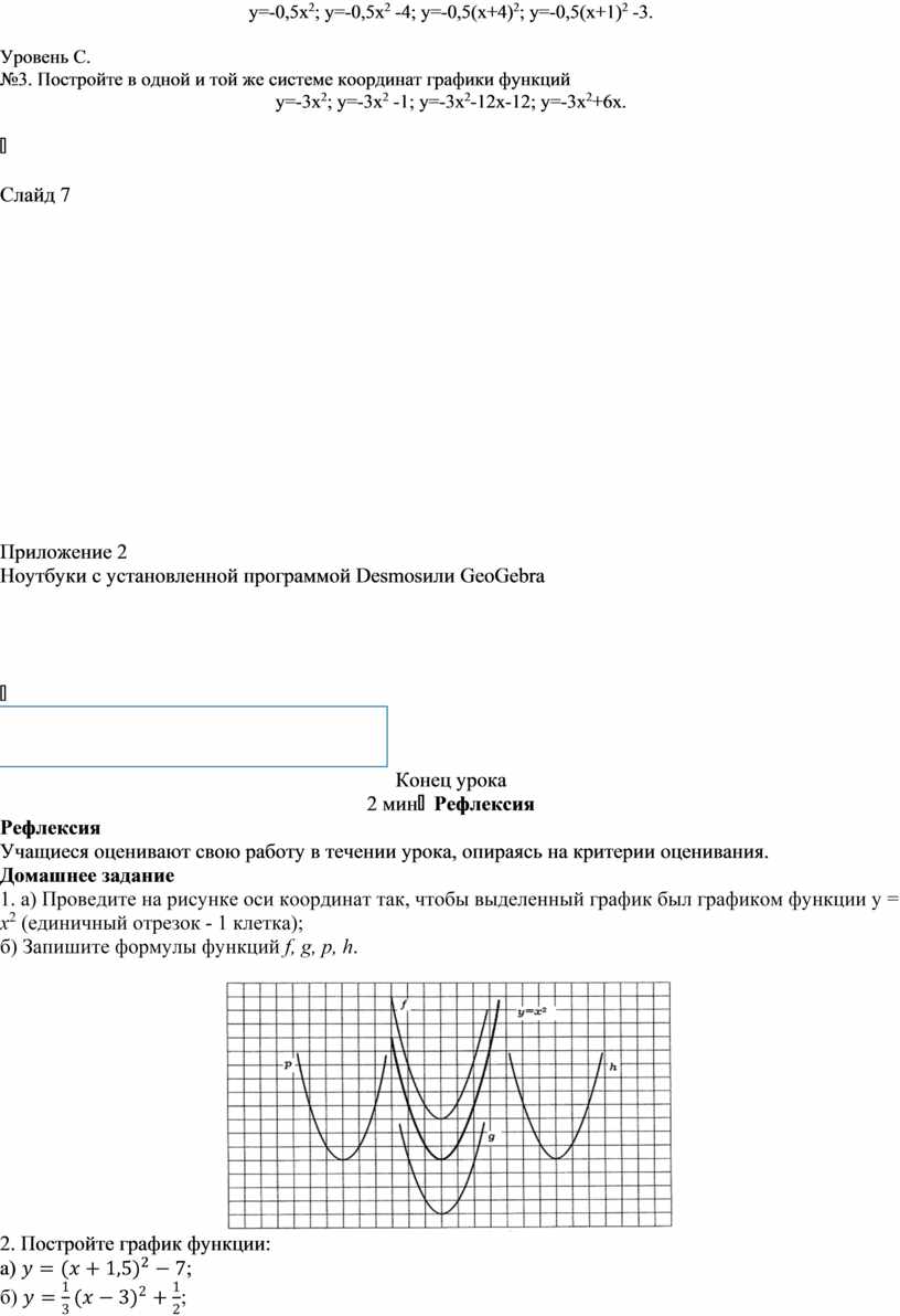 Рефлексия Учащиеся оценивают свою работу в течении урока, опираясь на критерии оценивания. Домашнее задание 1. а) Проведите на рисунке оси координат так, чтобы выделенный график был графиком функции у = х2 (единичный отрезок - 1 клетка); б) Запишите формулы функций f, g, p, h.