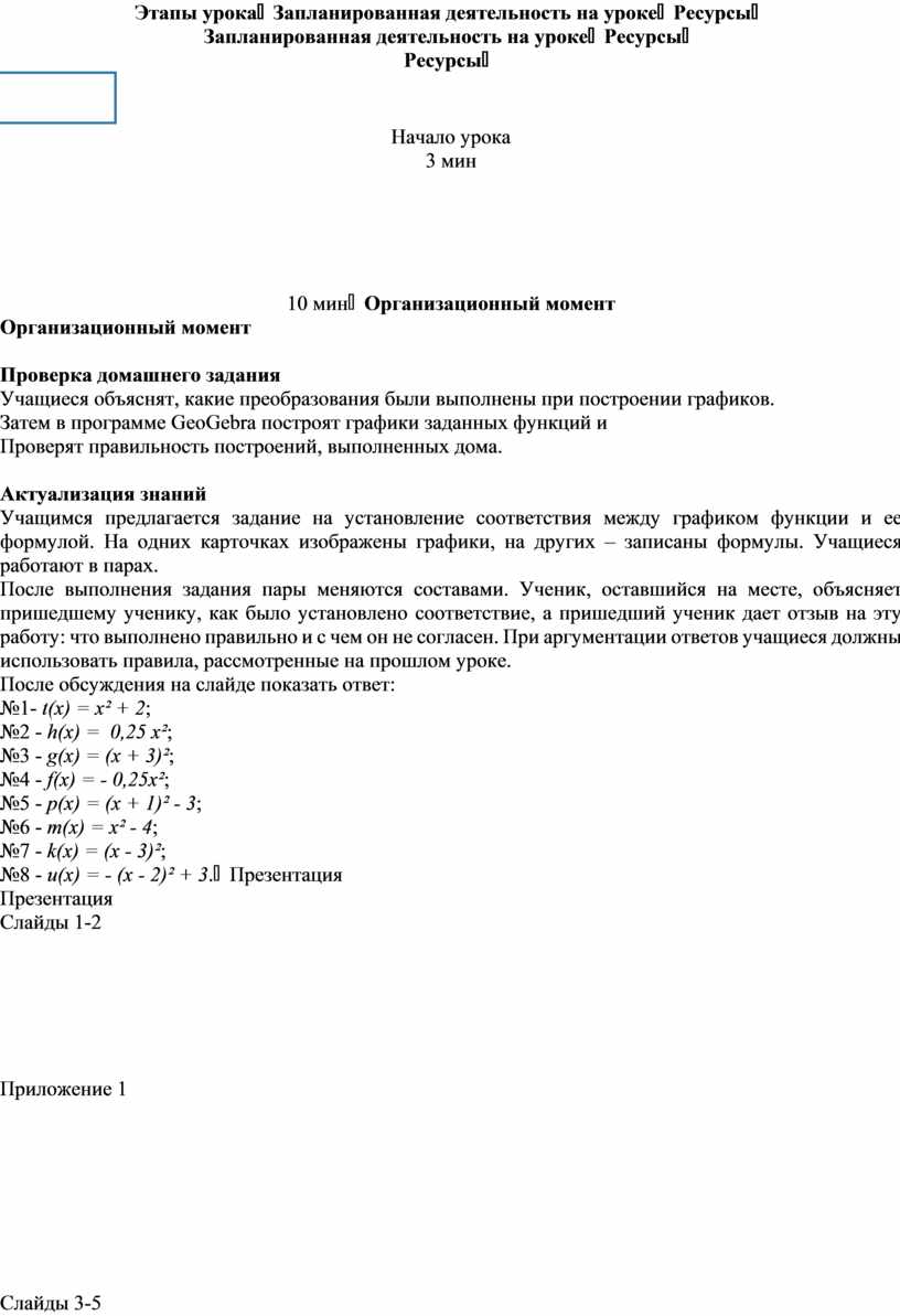 Проверка домашнего задания Учащиеся объяснят, какие преобразования были выполнены при построении графиков. Затем в программе GeoGebra построят графики заданных функций и Проверят правильность построений, выполненных дома.