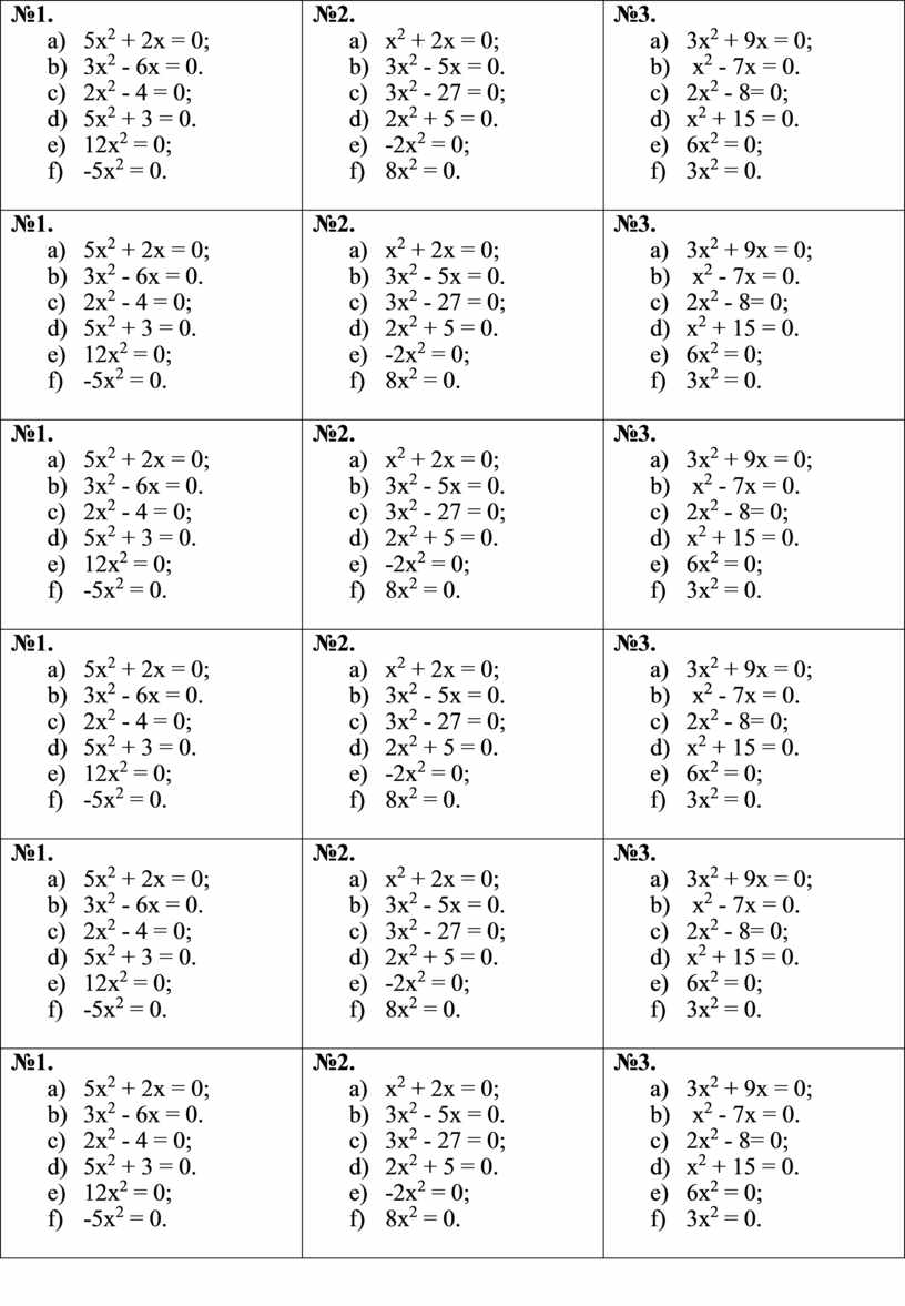 №1. a) 5х2 + 2х = 0; b) 3х2 - 6х = 0. c) 2х2 - 4 = 0; d) 5х2 + 3 = 0. e) 12х2 = 0; f) -5х2 = 0.