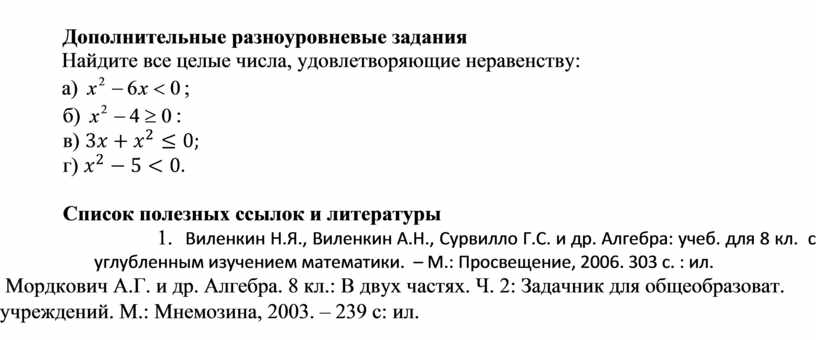 1. Виленкин Н.Я., Виленкин А.Н., Сурвилло Г.С. и др. Алгебра: учеб. для 8 кл. с углубленным изучением математики. – М.: Просвещение, 2006. 303 с. : ил.
