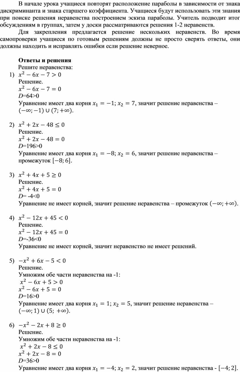 В начале урока учащиеся повторят расположение параболы в зависимости от знака дискриминанта и знака старшего коэффициента. Учащиеся будут использовать эти знания при поиске решения неравенства построением эскиза параболы. Учитель подводит итог обсуждениям в группах, затем у доски рассматриваются решения 1-2 неравенств.
