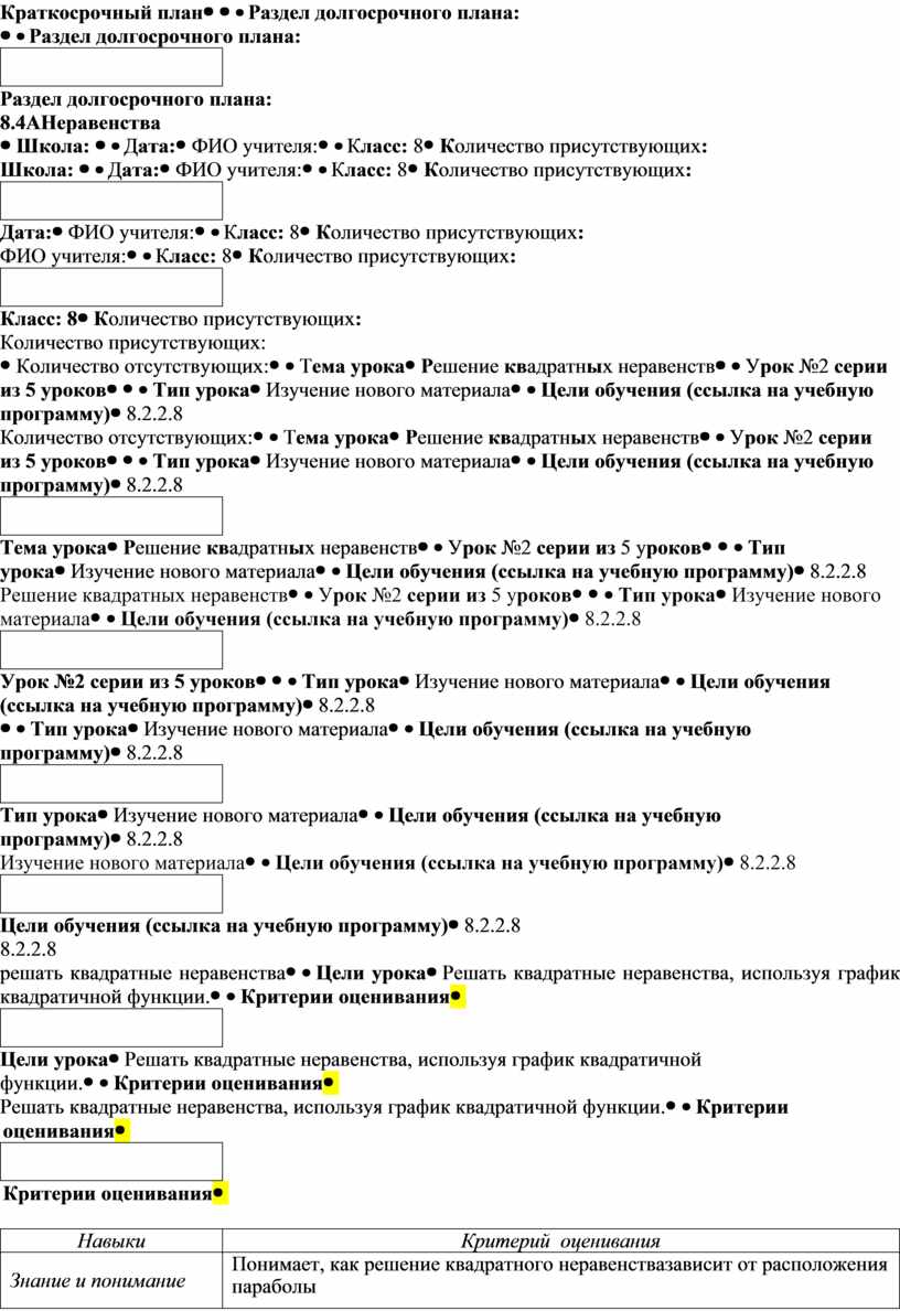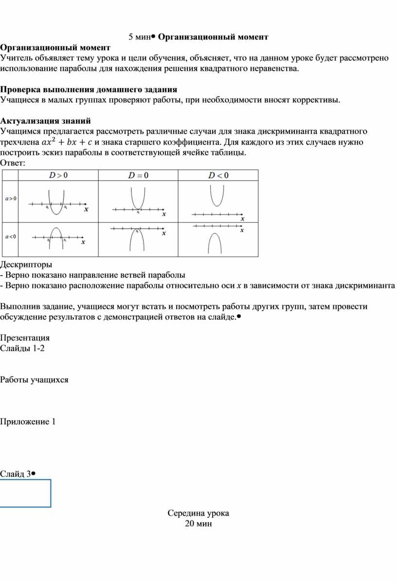 Организационный момент Учитель объявляет тему урока и цели обучения, объясняет, что на данном уроке будет рассмотрено использование параболы для нахождения решения квадратного неравенства.