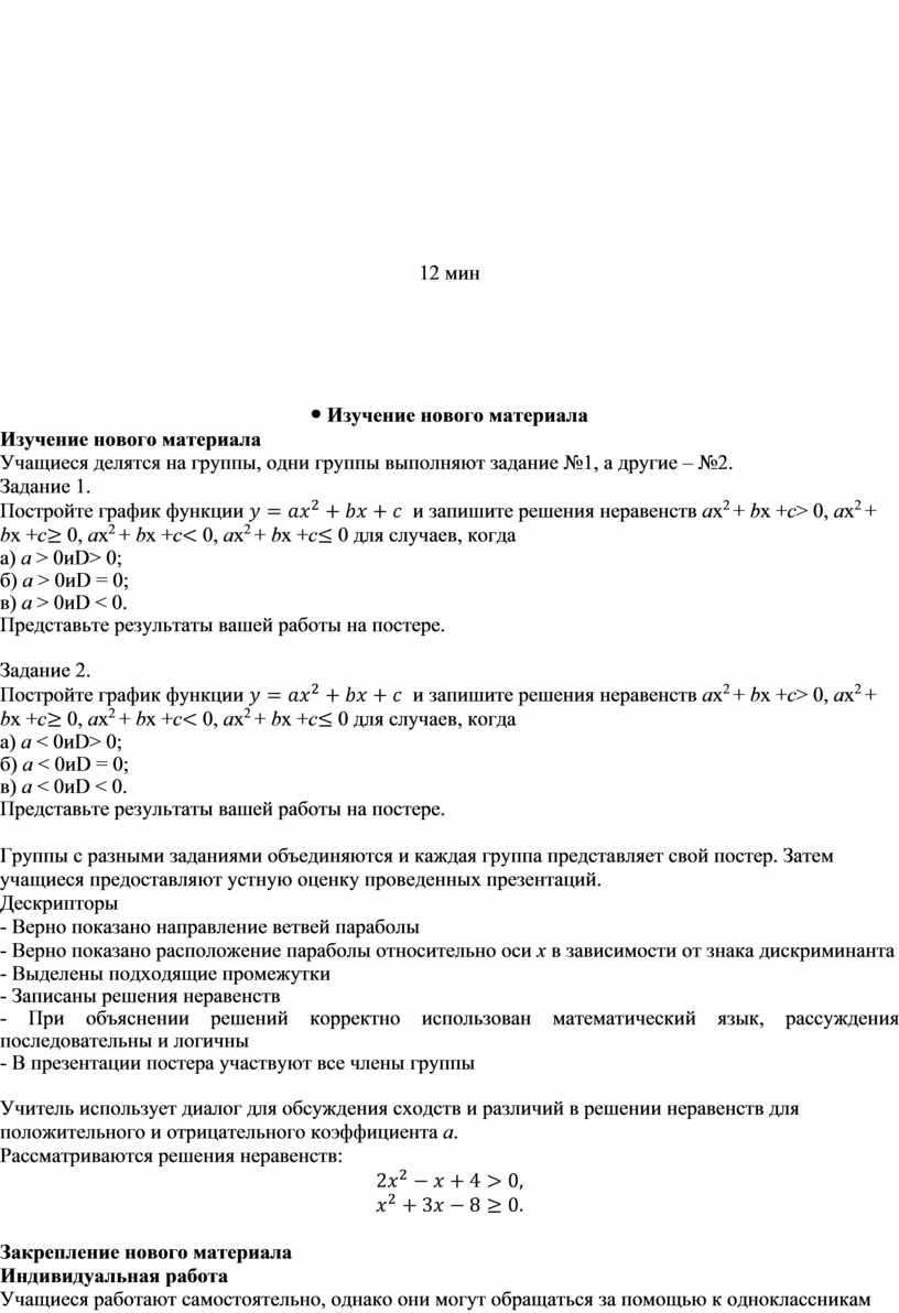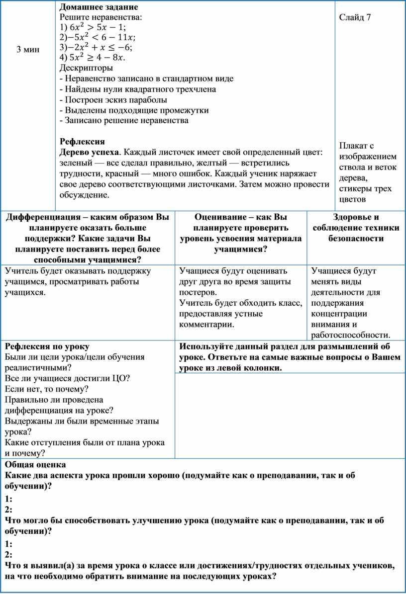 Группы с разными заданиями объединяются и каждая группа представляет свой постер. Затем учащиеся предоставляют устную оценку проведенных презентаций. Дескрипторы - Верно показано направление ветвей параболы - Верно показано расположение параболы относительно оси х в зависимости от знака дискриминанта - Выделены подходящие промежутки - Записаны решения неравенств - При объяснении решений корректно использован математический язык, рассуждения последовательны и логичны - В презентации постера участвуют все члены группы