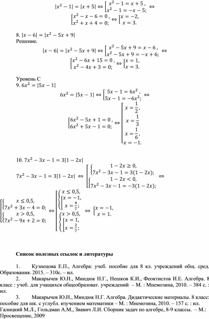 3. Макарычев Ю.Н., Миндюк Н.Г. Алгебра. Дидактические материалы. 8 класс: пособие для шк. с углубл. изучением математики – М. : Мнемозина, 2010. – 157 с. : ил.