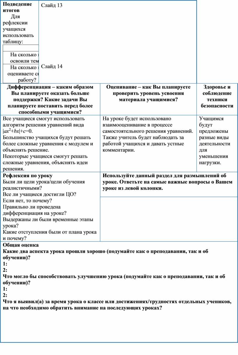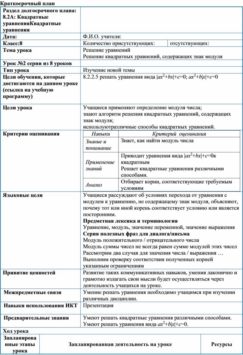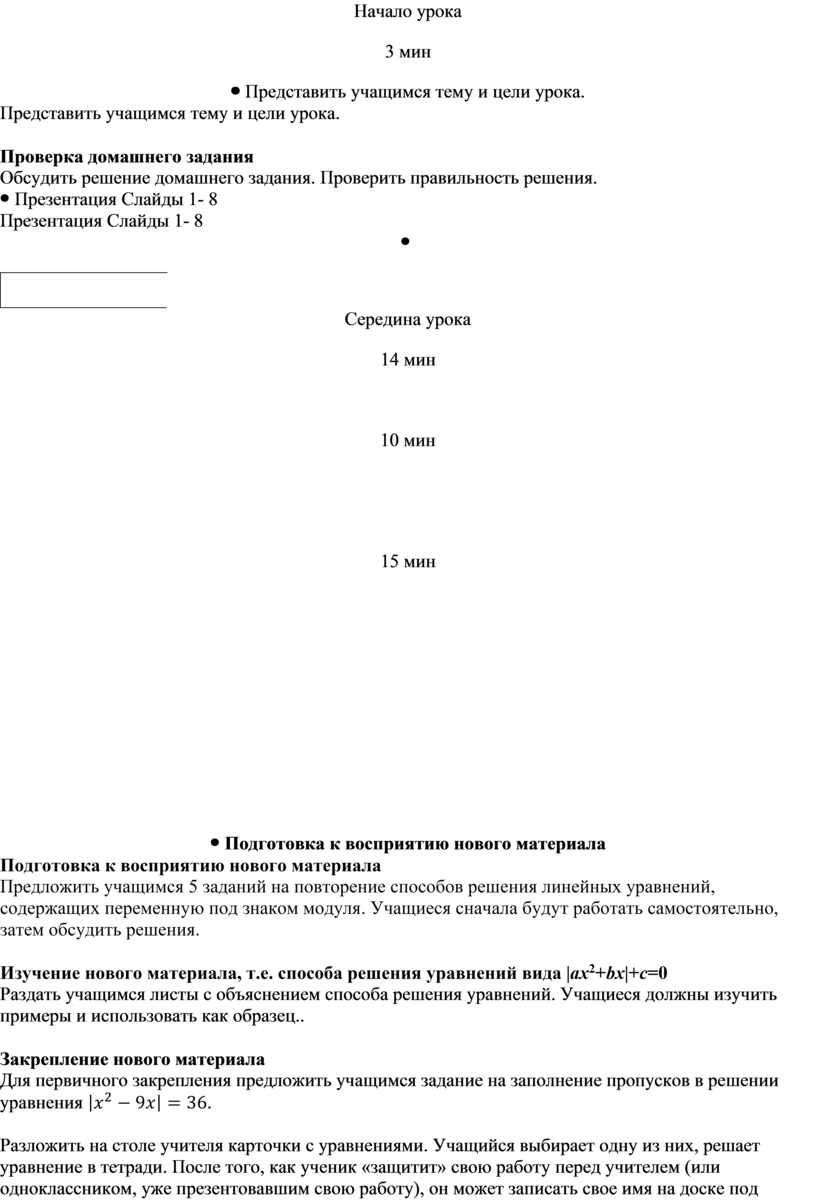 Все учащиеся смогут использовать алгоритм решения уравнений вида |ax2+bx|+c=0. Большинство учащихся будут решать более сложные уравнения с модулем и объяснять решение. Некоторые учащиеся смогут решать сложные уравнения, объяснять идеи решения. |