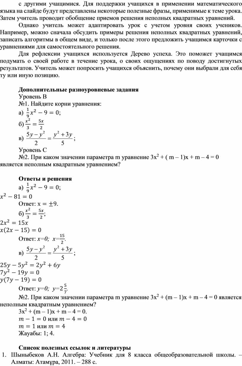 Однако учитель может адаптировать урок с учетом уровня своих учеников. Например, можно сначала обсудить примеры решения неполных квадратных уравнений, записать алгоритмы в общем виде, и только после этого предложить учащимся карточки с уравнениями для самостоятельного решения.