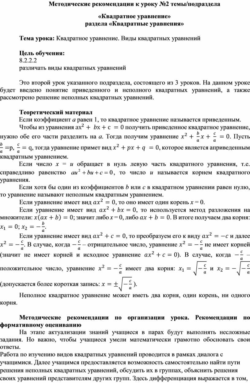 Это второй урок указанного подраздела, состоящего из 3 уроков. На данном уроке будет введено понятие приведенного и неполного квадратных уравнений, а также рассмотрено решение неполных квадратных уравнений.