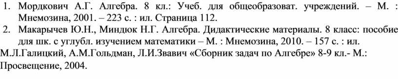 2. Мордкович А.Г. Алгебра. 8 кл.: Учеб. для общеобразоват. учреждений. – М. : Мнемозина, 2001. – 223 с. : ил. Страница 112.