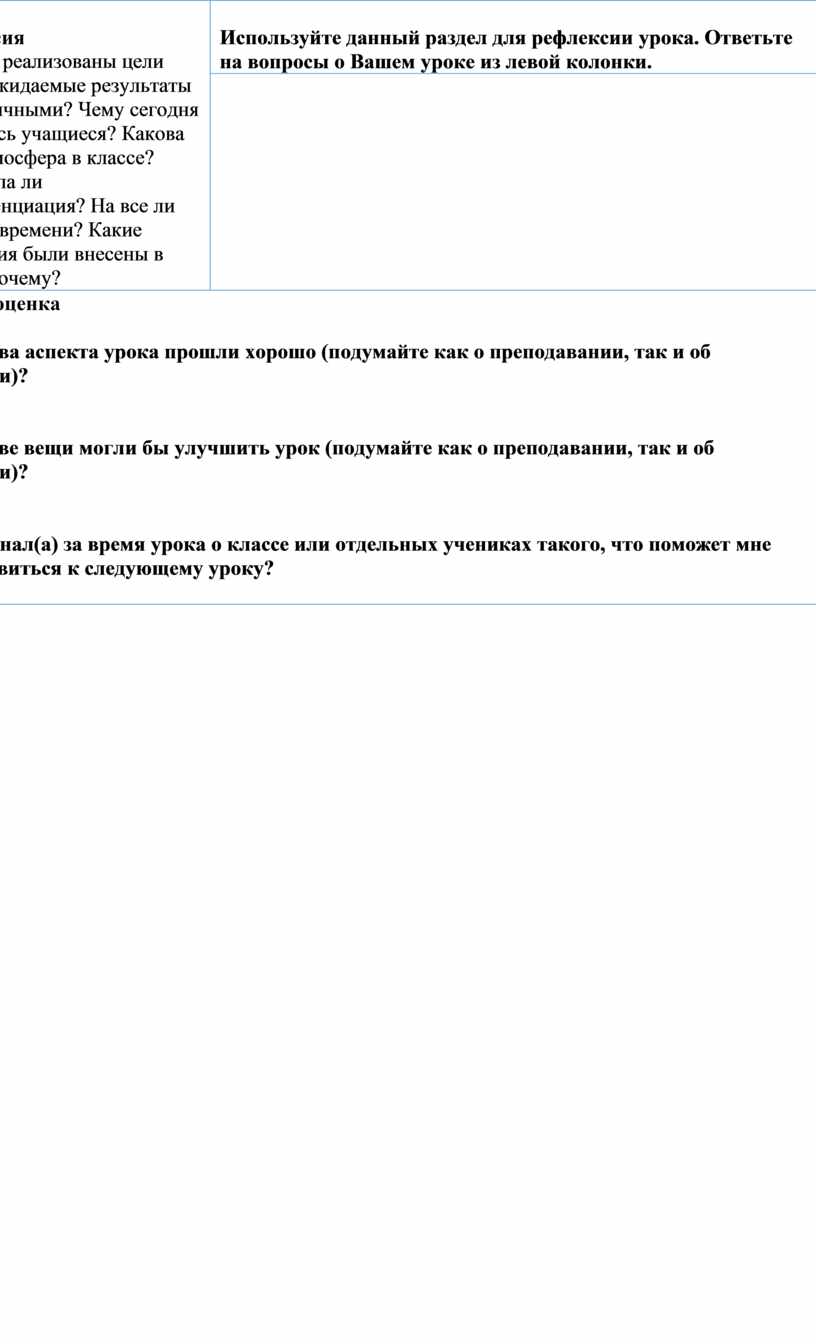 Используйте данный раздел для рефлексии урока. Ответьте на вопросы о Вашем уроке из левой колонки. |