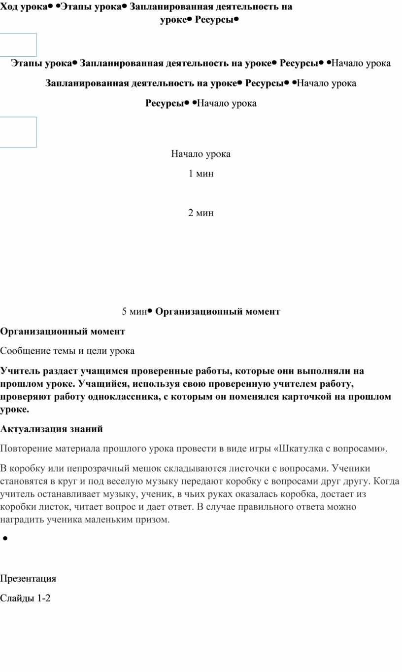Организационный момент Сообщение темы и цели урока Учитель раздаст учащимся проверенные работы, которые они выполняли на прошлом уроке. Учащийся, используя свою проверенную учителем работу, проверяют работу одноклассника, с которым он поменялся карточкой на прошлом уроке. Актуализация знаний Повторение материала прошлого урока провести в виде игры «Шкатулка с вопросами». В коробку или непрозрачный мешок складываются листочки с вопросами. Ученики становятся в круг и под веселую музыку передают коробку с вопросами друг другу. Когда учитель останавливает музыку, ученик, в чьих руках оказалась коробка, достает из коробки листок, читает вопрос и дает ответ. В случае правильного ответа можно наградить ученика маленьким призом.