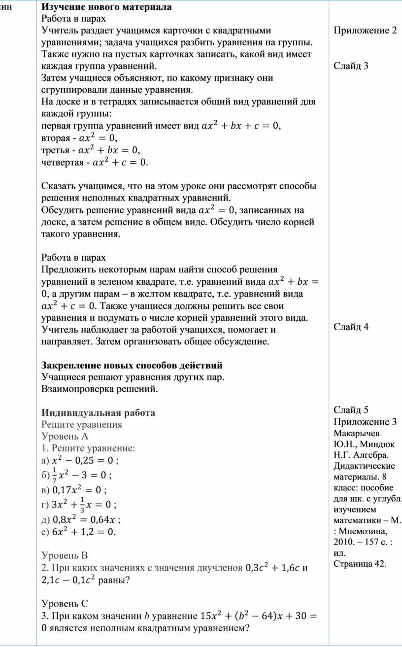 Сказать учащимся, что на этом уроке они рассмотрят способы решения неполных квадратных уравнений. Обсудить