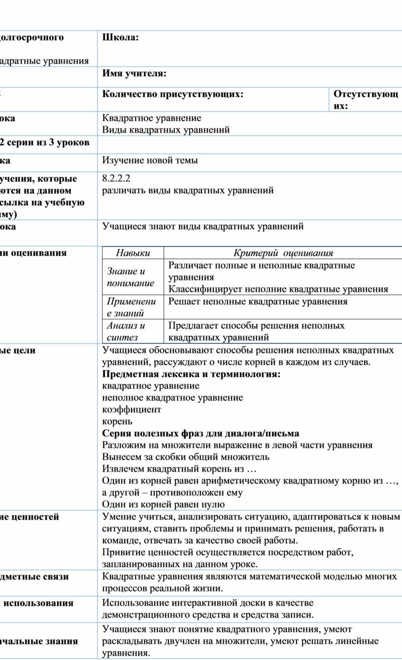 8.2.2.2 различать виды квадратных уравнений |