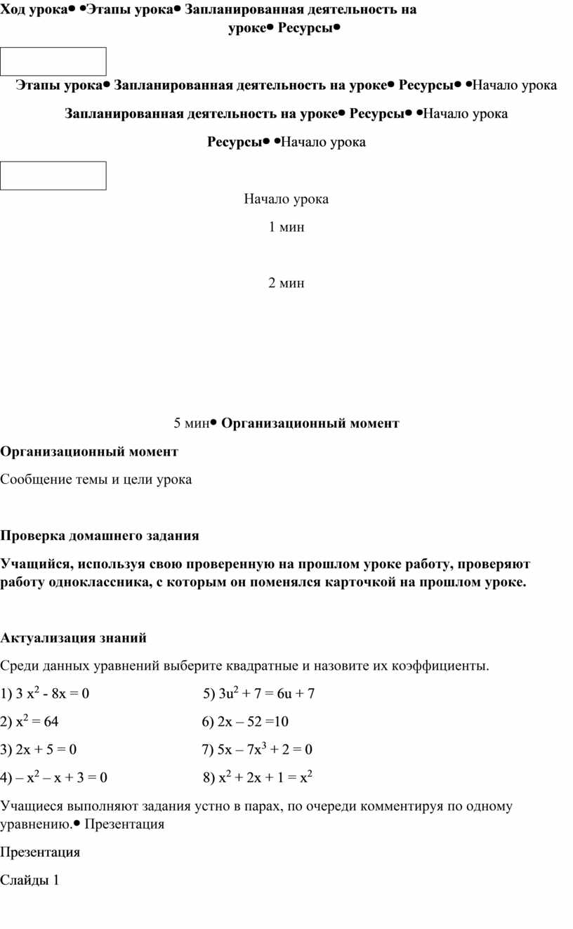 Учащиеся формулируют определение квадратного уравнения. обосновывают способы решения неполных квадратных уравнений, рассуждают о числе корней в каждом из случаев. Предметная лексика и терминология: квадратное уравнение неполное квадратное уравнение коэффициент корень Серия полезных фраз для диалога/письма Уравнение не является квадратным, так как … Разложим на множители выражение в левой части уравнения Произведение равно 0, если хотя бы один из множителей равен 0. Вынесем за скобки общий множитель Извлечем квадратный корень из … Один из корней равен арифметическому квадратному корню из …, а другой – противоположен ему Один из корней равен нулю |