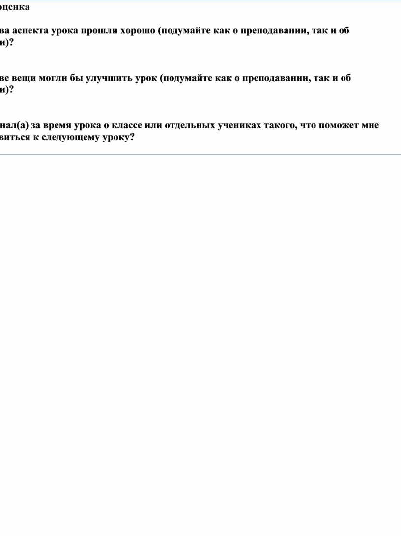 Какие два аспекта урока прошли хорошо (подумайте как о преподавании, так и об изучении)? 1: 2: Какие две вещи могли бы улучшить урок (подумайте как о преподавании, так и об изучении)? 1: 2: Что я узнал(а) за время урока о классе или отдельных учениках такого, что поможет мне подготовиться к следующему уроку?