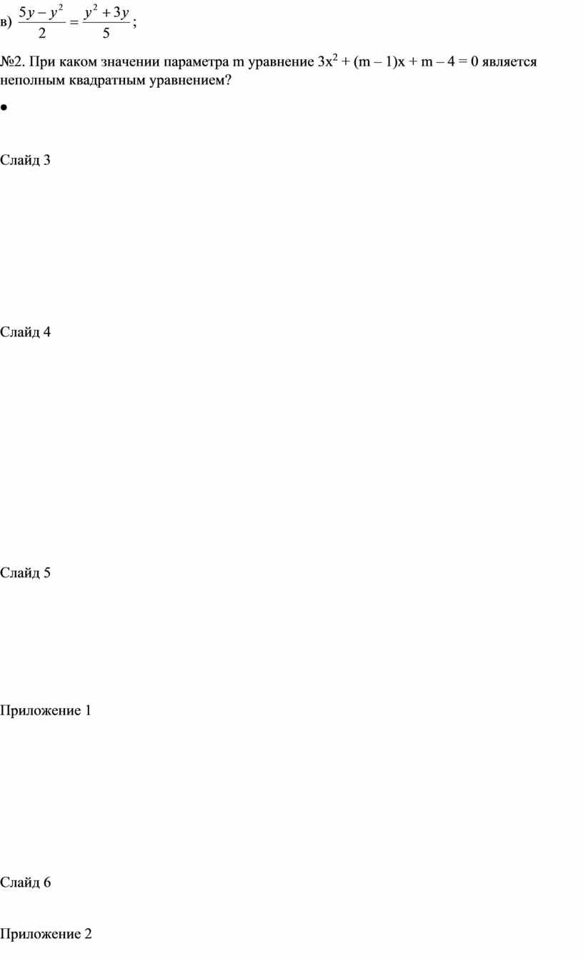 №2. При каком значении параметра m уравнение 3х2 + (m – 1)x + m – 4 = 0 является неполным квадратным уравнением?