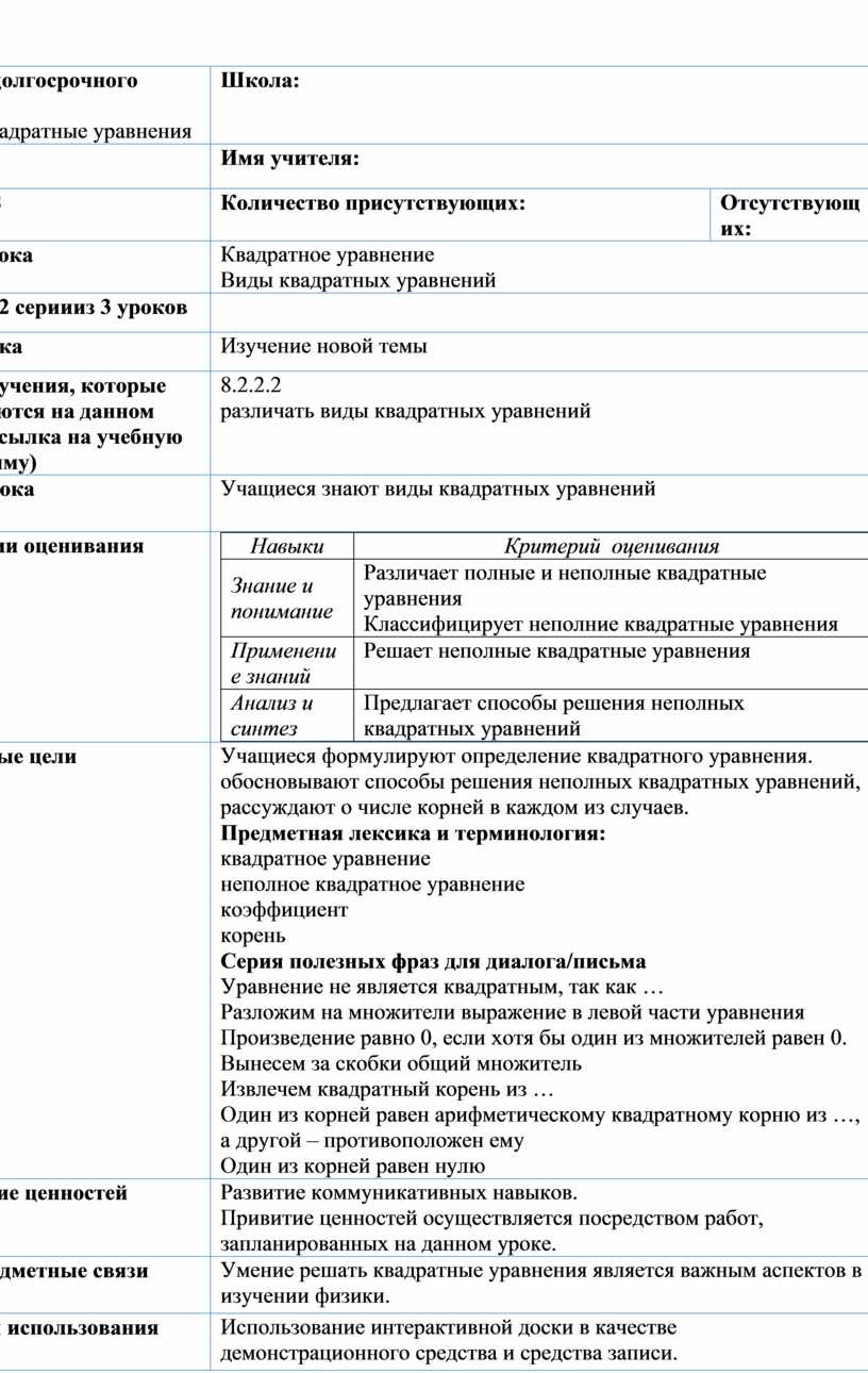 8.2.2.2 различать виды квадратных уравнений |