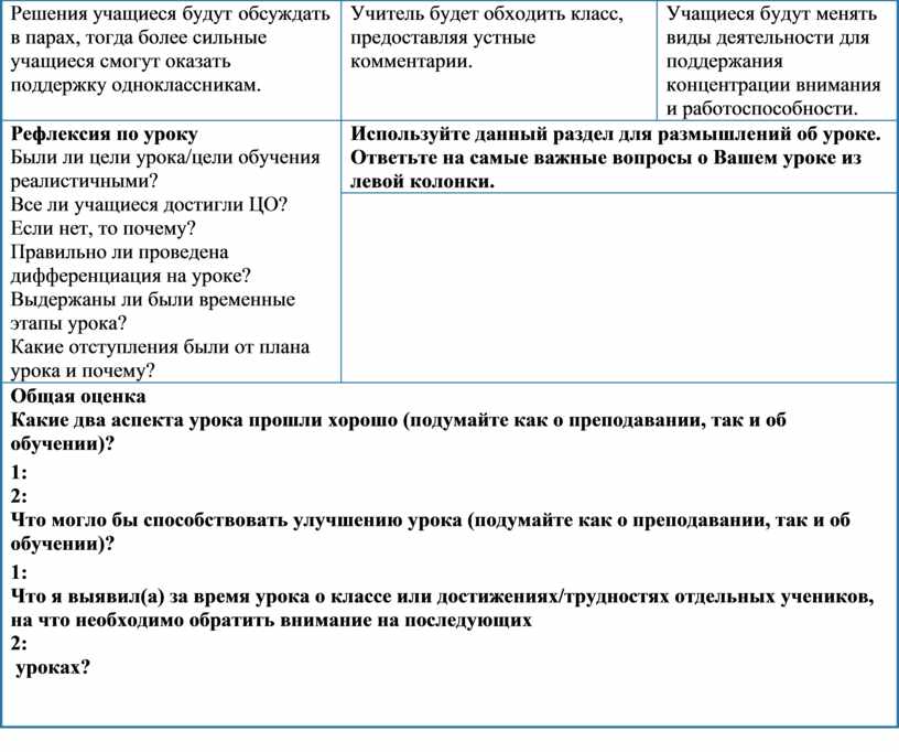Используйте данный раздел для размышлений об уроке. Ответьте на самые важные вопросы о Вашем уроке из левой колонки. |