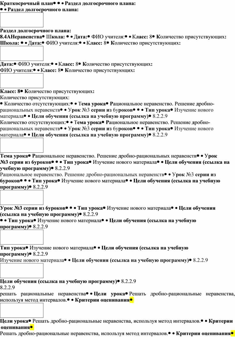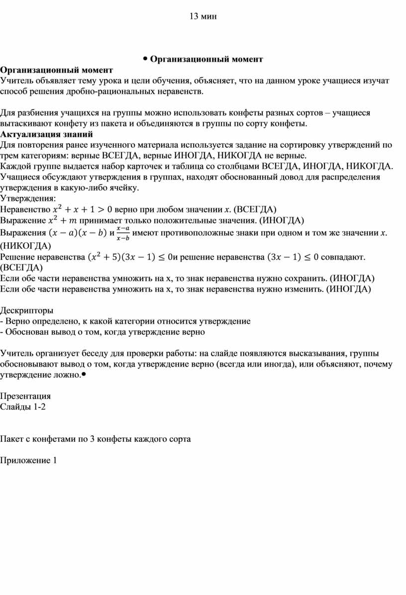 Организационный момент Учитель объявляет тему урока и цели обучения, объясняет, что на данном уроке учащиеся изучат способ решения дробно-рациональных неравенств.