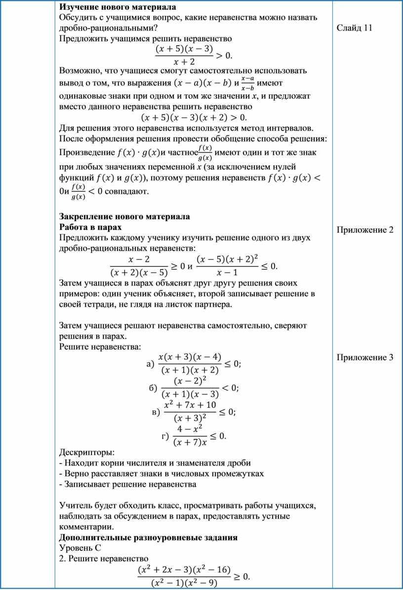 Дескрипторы - Находит корни числителя и знаменателя дроби - Верно расставляет знаки в числовых промежутках - Записывает решение неравенства
