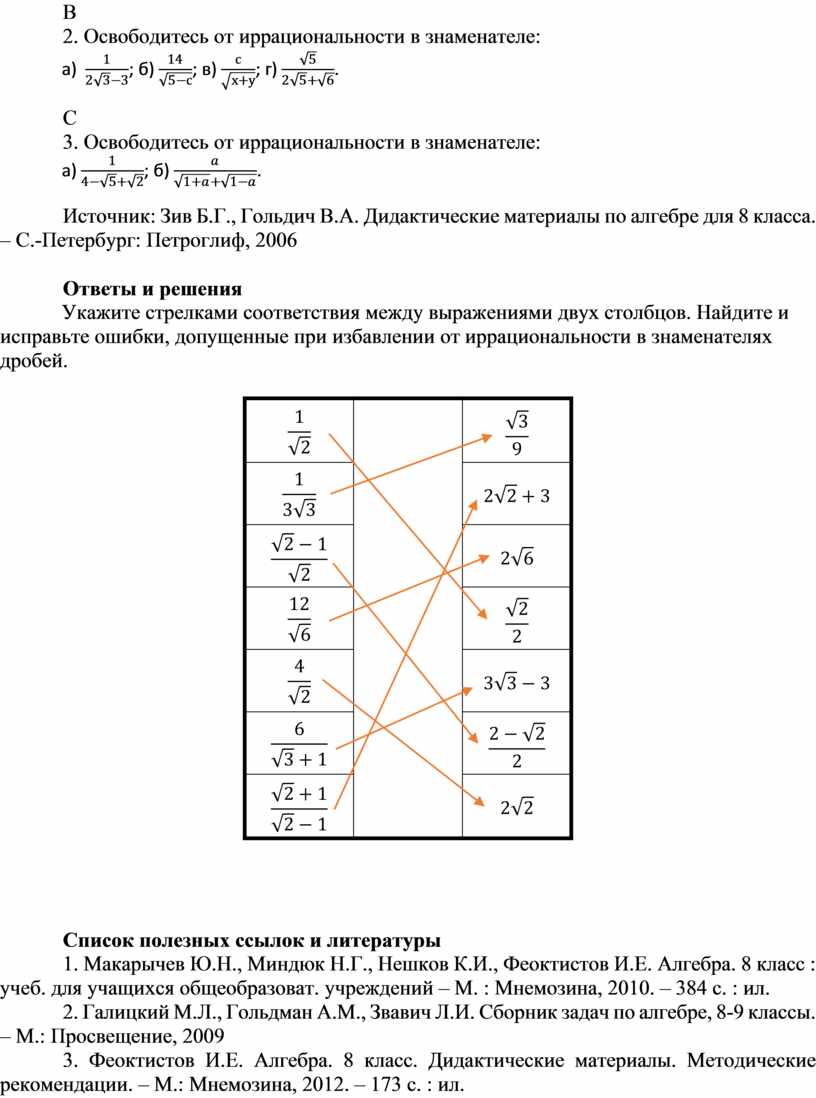 Укажите стрелками соответствия между выражениями двух столбцов. Найдите и исправьте ошибки, допущенные при избавлении от иррациональности в знаменателях дробей.