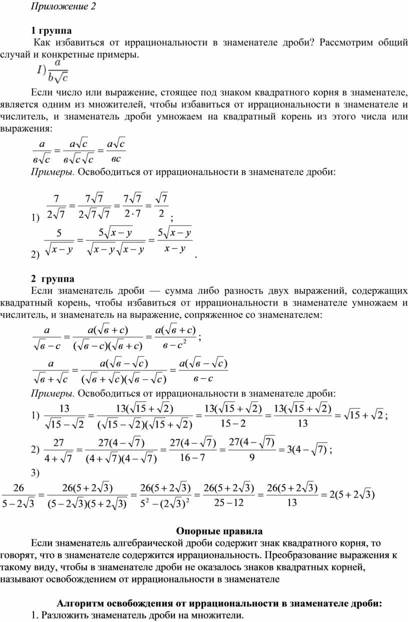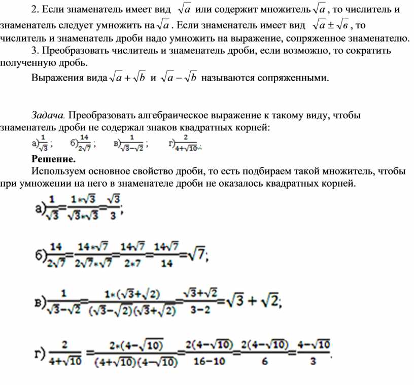 Если знаменатель алгебраической дроби содержит знак квадратного корня, то говорят, что в знаменателе содержится иррациональность. Преобразование выражения к такому виду, чтобы в знаменателе дроби не оказалось знаков квадратных корней, называют освобождением от иррациональности в знаменателе