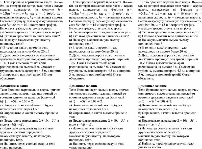 1. Тело брошено вертикально вверх. Высота (h), на которой находится тело через t