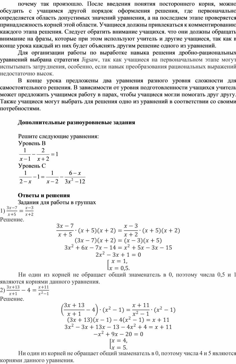 Для организации работы по выработке навыка решения дробно-рациональных уравнений выбрана стратегия Jigsaw, так как учащиеся на первоначальном этапе могут испытывать затруднения, особенно, если навык преобразования рациональных выражений недостаточно высок.
