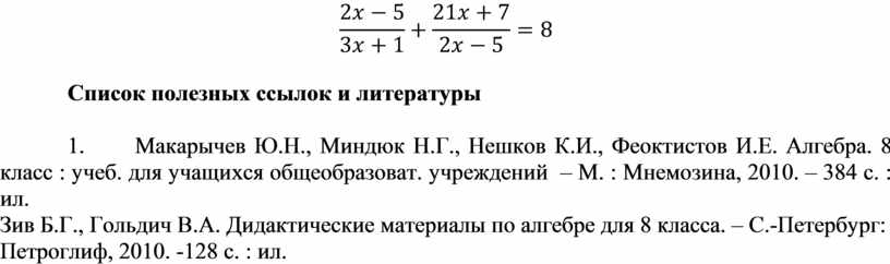 1. Макарычев Ю.Н., Миндюк Н.Г., Нешков К.И., Феоктистов И.Е. Алгебра. 8 класс : учеб. для учащихся общеобразоват. учреждений – М. : Мнемозина, 2010. – 384 с. : ил.