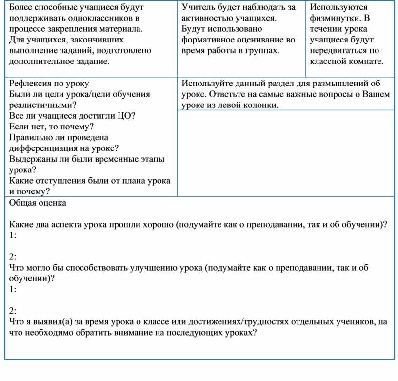 Используйте данный раздел для размышлений об уроке. Ответьте на самые важные вопросы о Вашем уроке из левой колонки. |